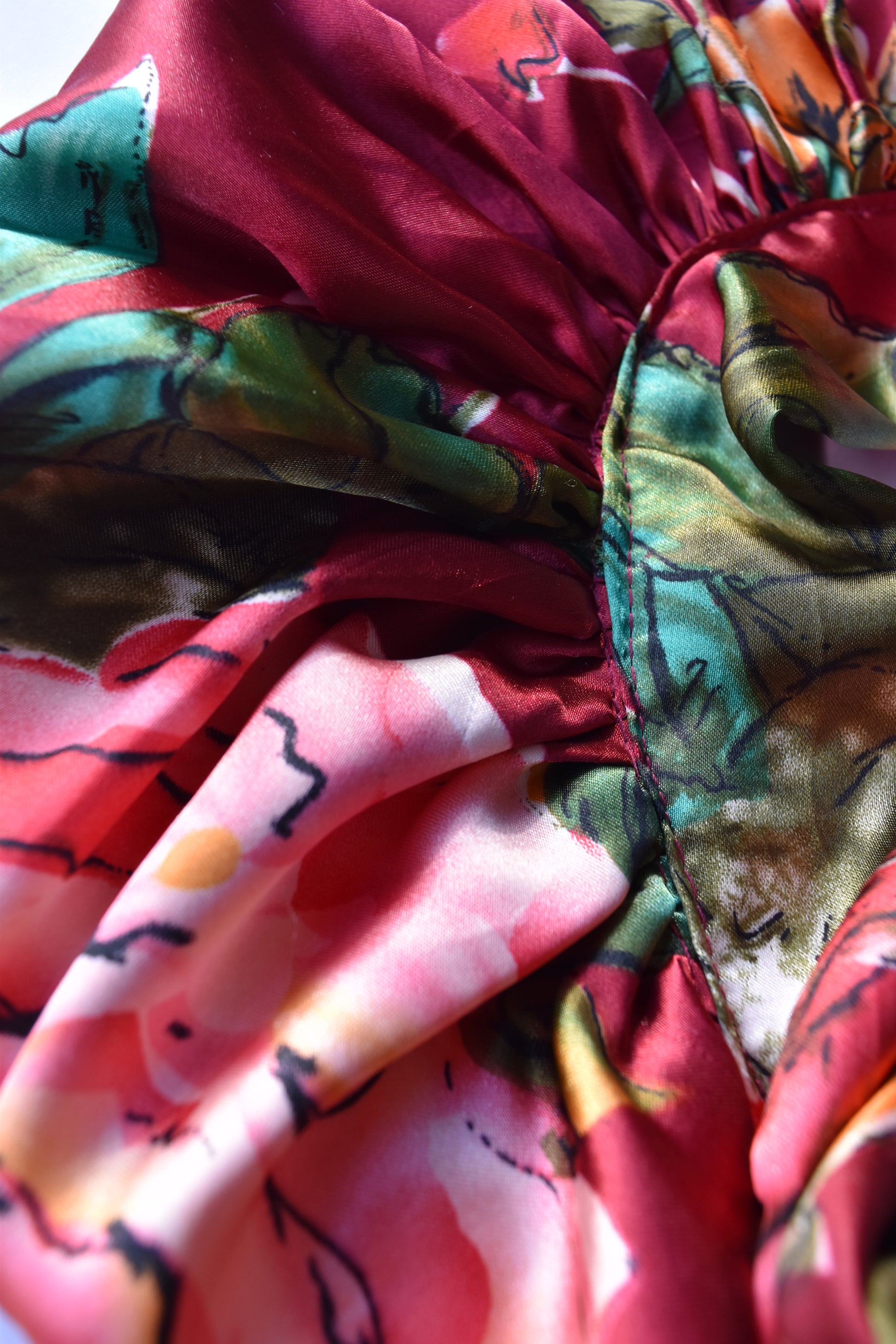 - Vibrant floral print in red, green & orange hues