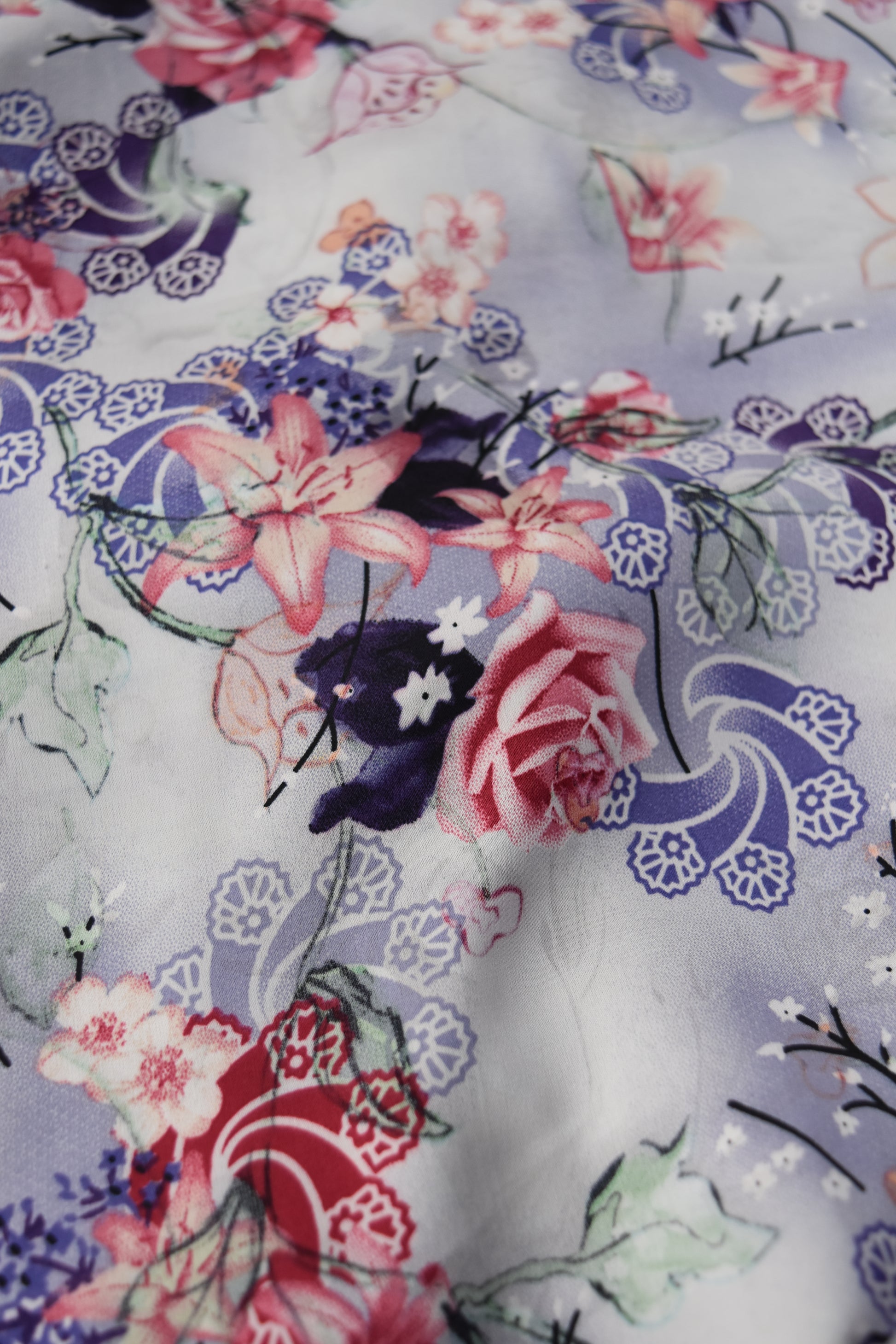 - Delicate pastel floral print in lilac, rose, and soft violet