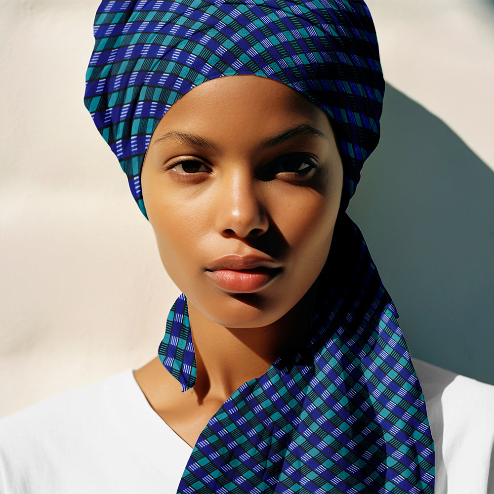 Add a bold pop to your outfit with this blue patterned headwrap,. Made from lightweight, breathable fabric, this headwrap is perfect for protecting curly and coily hair. Its size allows for various styling options, making it ideal for natural hair, locs, twists, and braids. Whether for everyday wear or a special occasion, this African-inspired headwrap adds a touch of elegance and versatility to any look.