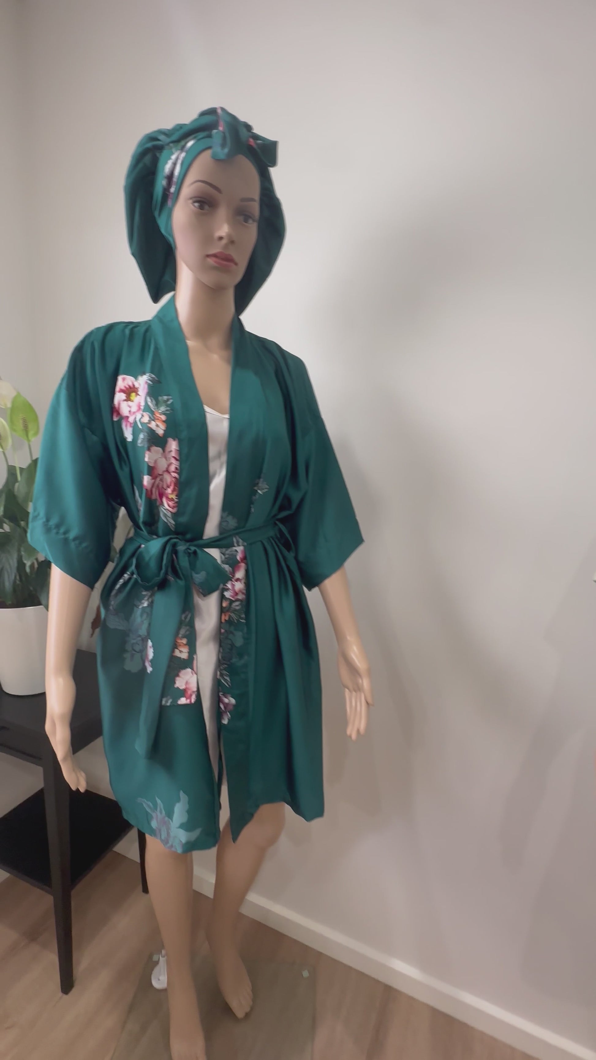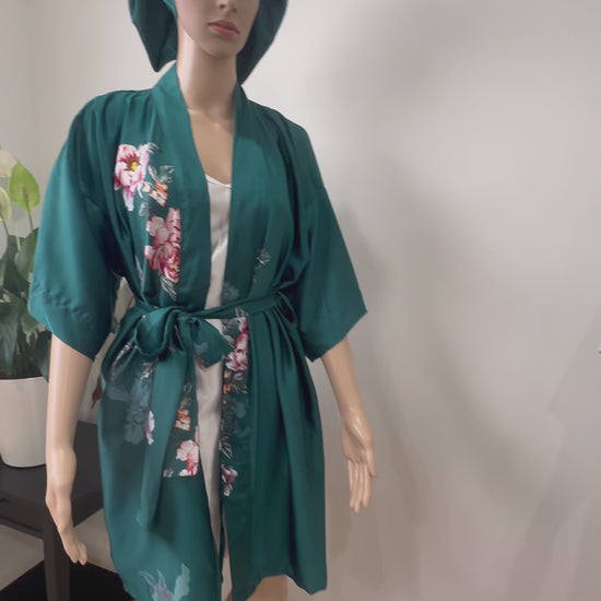 A timeless tribute to botanical beauty and effortless grace. Crafted from smooth, breathable satin in a rich emerald green, this robe is adorned with delicate floral prints that add a whisper of romance and refinement.