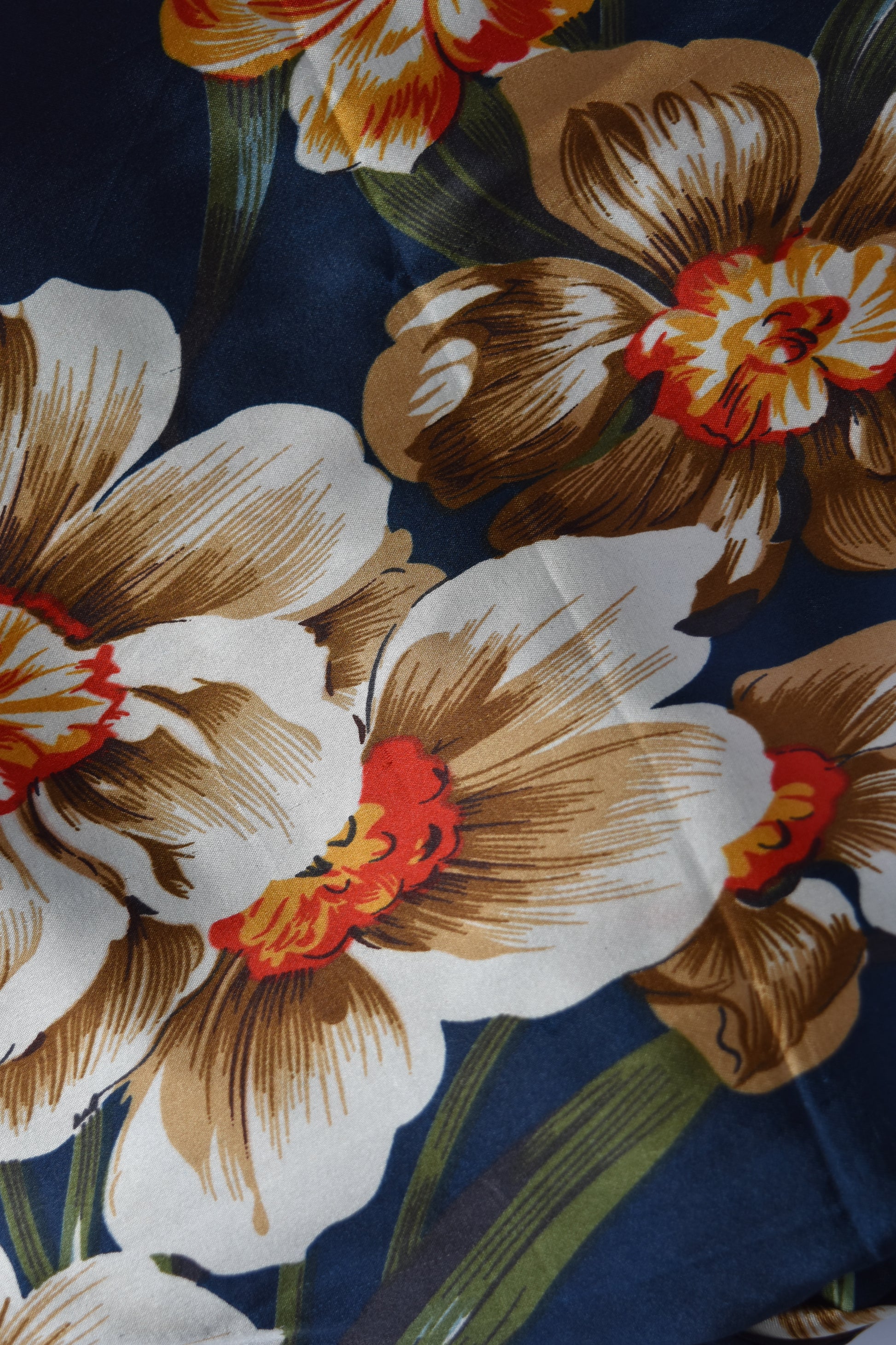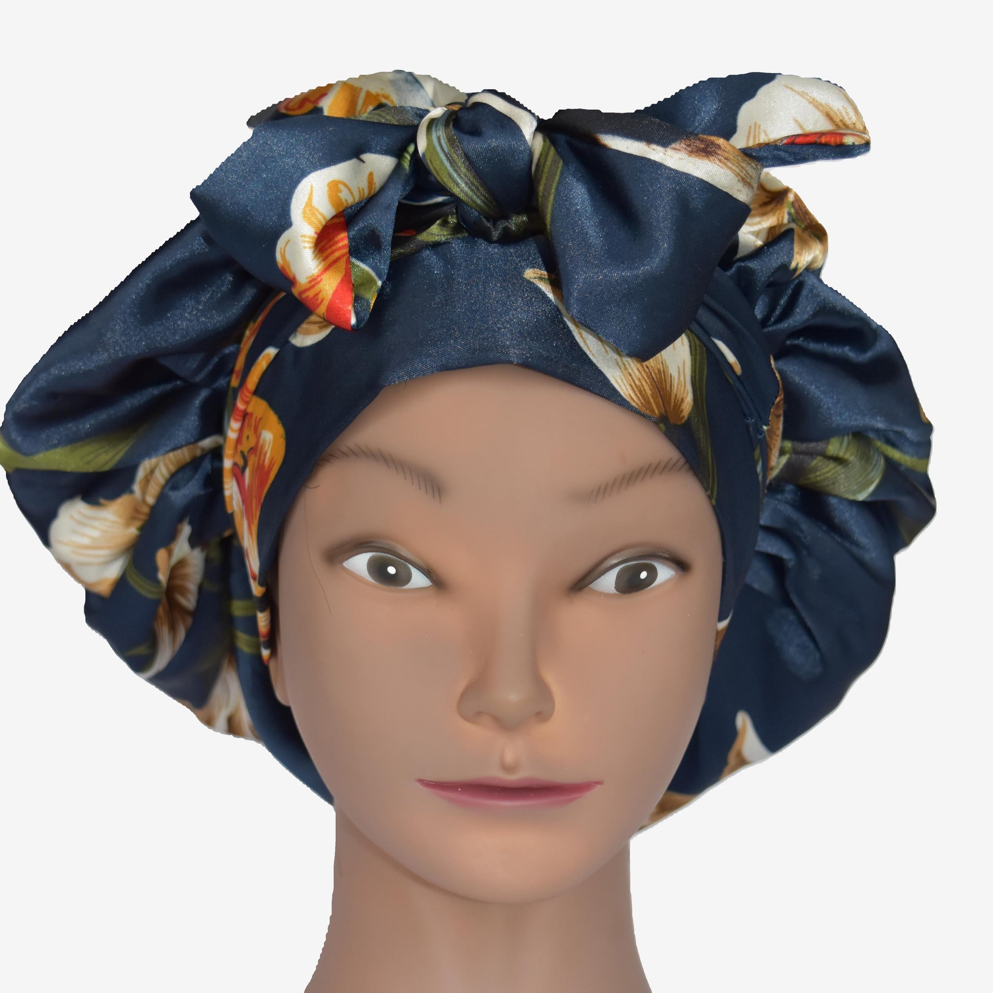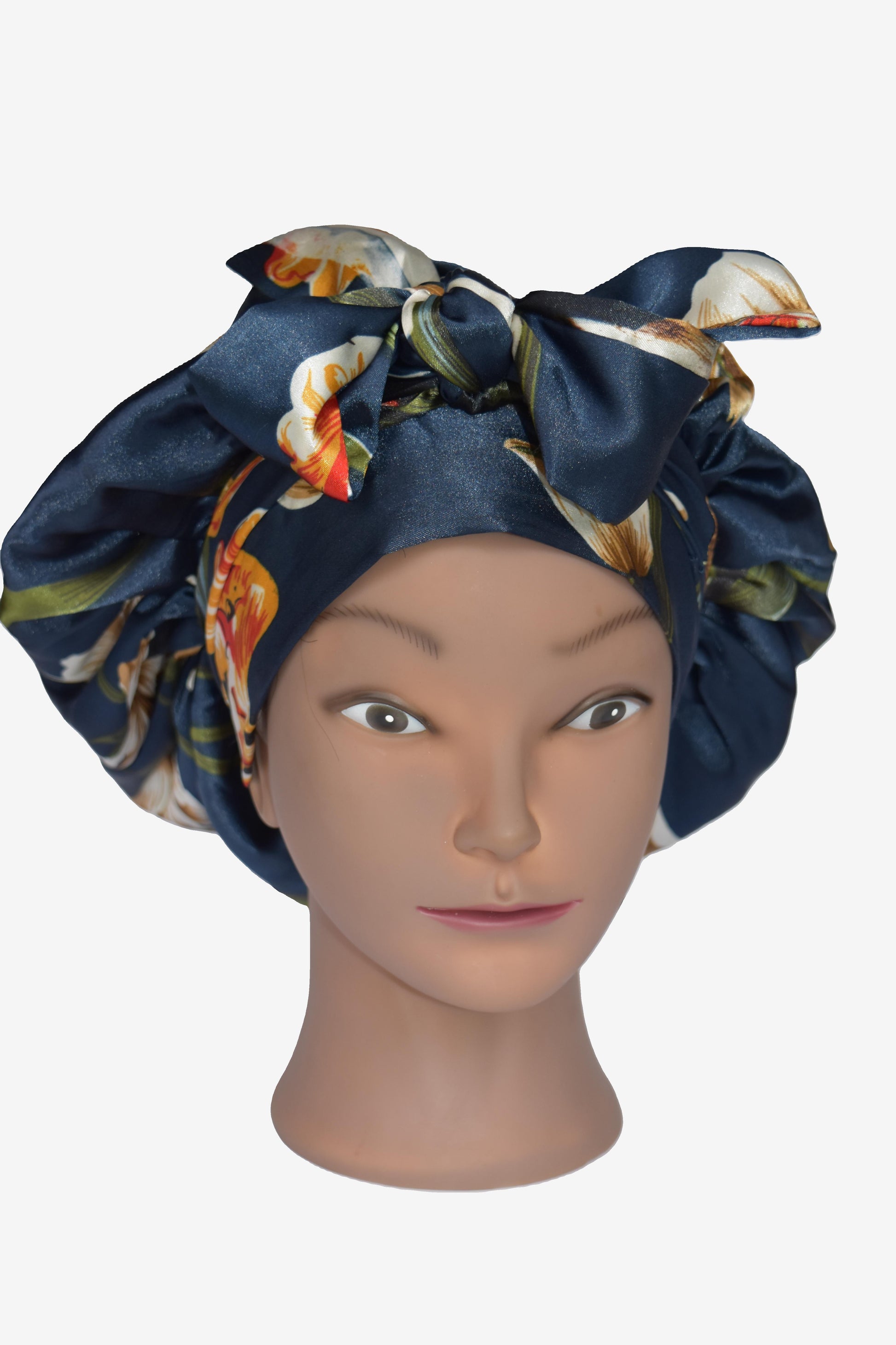 Slip into the evening with Nuru, a rich navy satin bonnet adorned with warm floral tones and effortless charm. Made for the woman who values both care and style, this elegant wrap is your go-to accessory from pamper nights to polished days.