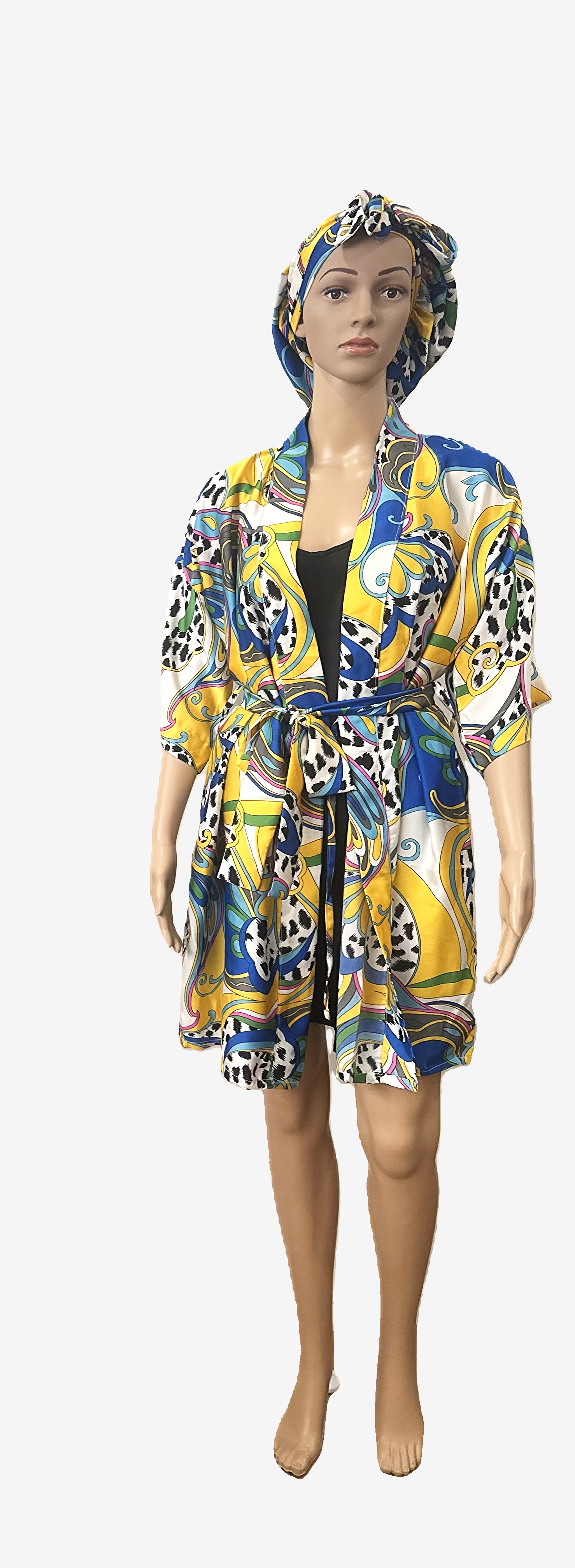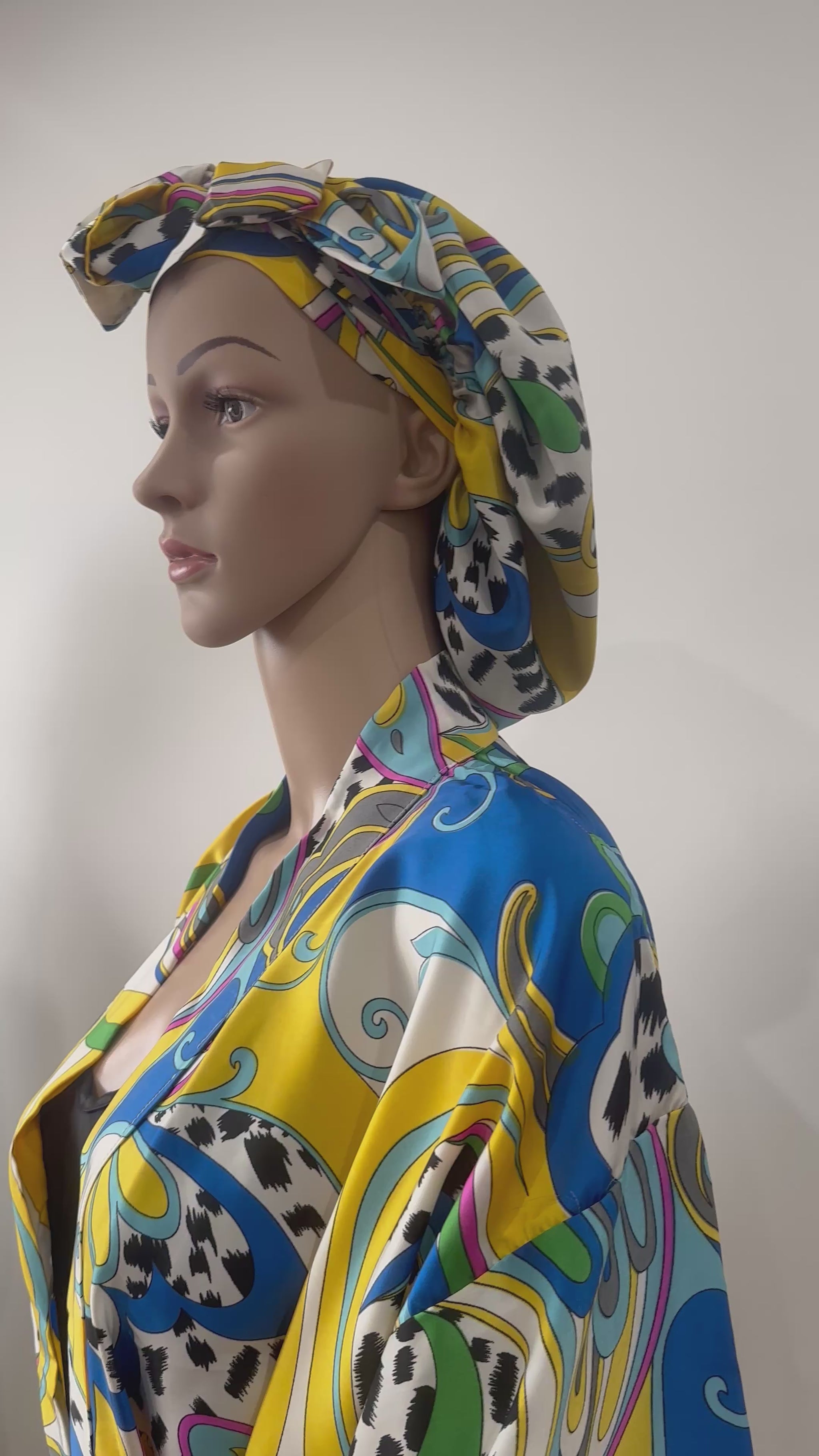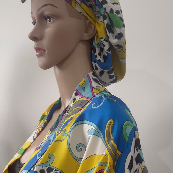 The Safari Satin Robe , Slip & Bonnet Set is a vibrant celebration of wild beauty and bold expression. Featuring a swirl of sunshine yellow, royal blue, and striking animal print, this piece brings fierce femininity into every moment.