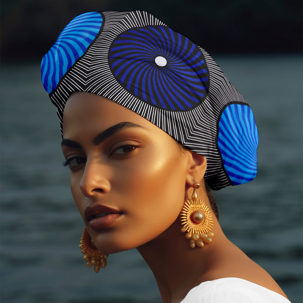 Embrace timeless elegance with this navy blue headwrap featuring black circular shapes. The subtle contrast of deep navy and bold black creates a unique and sophisticated pattern that’s perfect for adding a chic touch to any outfit. Ideal for all hair types, including curly and coily textures, this headwrap offers both style and protection, making it a must-have for everyday wear or special occasions.